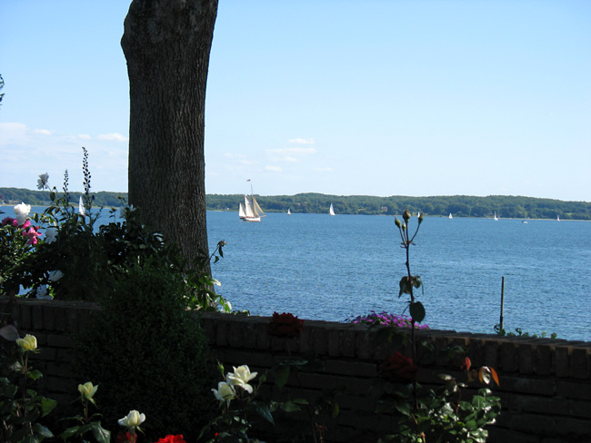 Die obigen Bilder stammen alle von Spaziergängen am Meeresufer entlang. Wird also Zeit, den Blick aufs Meer zu werfen. Hier vom Garten eines Kaffeehauses in Dänemark aus, wo ich auch eine lokale Spezialität: Schwarzbrottorte, verkostet habe. Schmeckt hervorragend. Man darf sich da vom Namen keinesfalls abhalten lassen *gg*. |