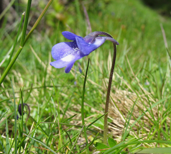Auch in Blau gibts das Fettkraut zu finden, hier ist es Pinguicula leptoceras, das Dünnsporn-Fettkraut. Auch hier die Blüte in etwa in